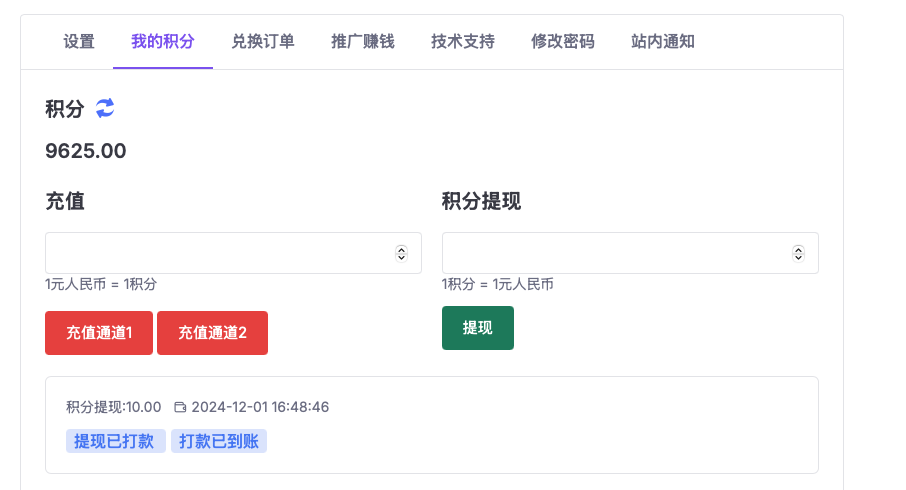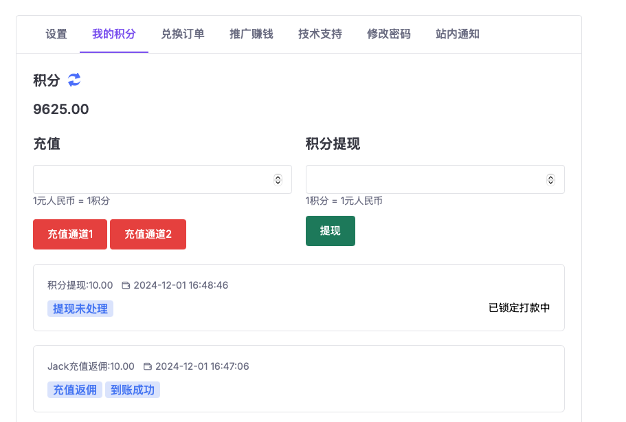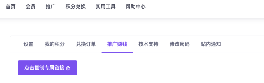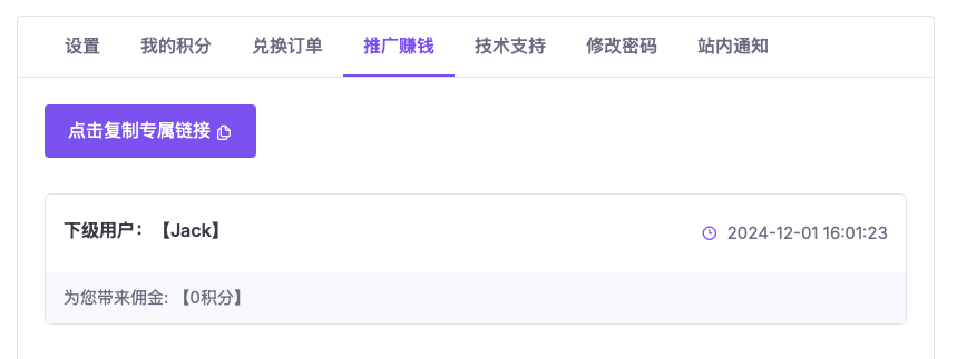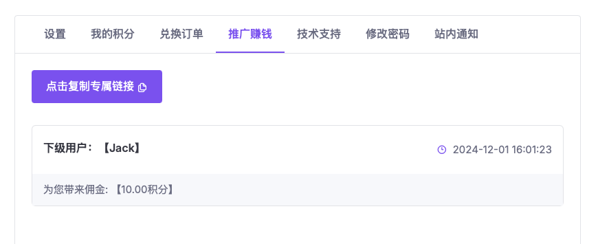 下级用户使用了100积分后,在推广赚钱栏可以查询到下级用户所为您带来的佣金收益(以10%佣金比例)。
