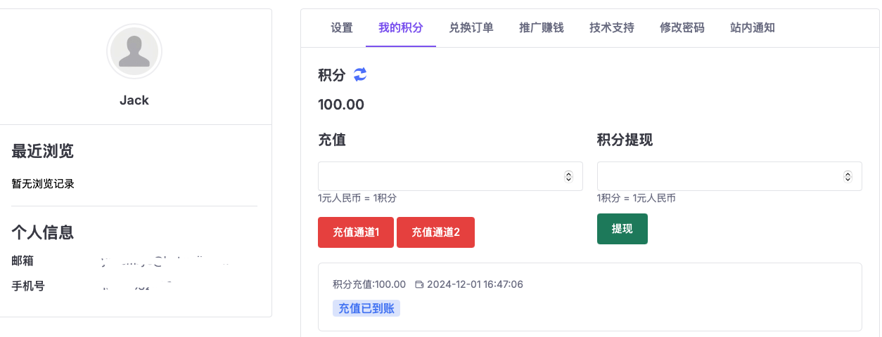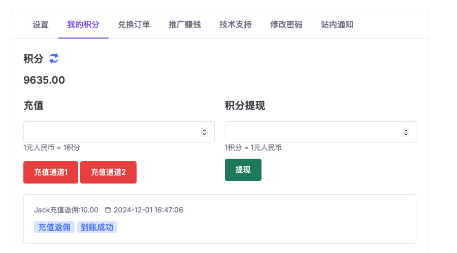 在我的积分栏可以查询当前积分,并可以核对下级用户返佣到账情况。